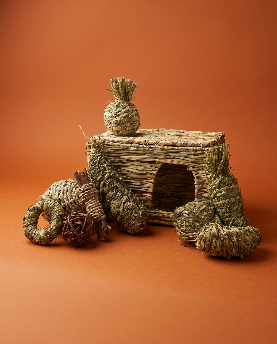 Items Included: Hay House, Timothy Poop, Timothy Carrot, Timothy O, Willow Ball, Jumbo Hay Ball, Piggy Stick, Timothy Banana, Timothy Apple & Timothy Hay Ball.